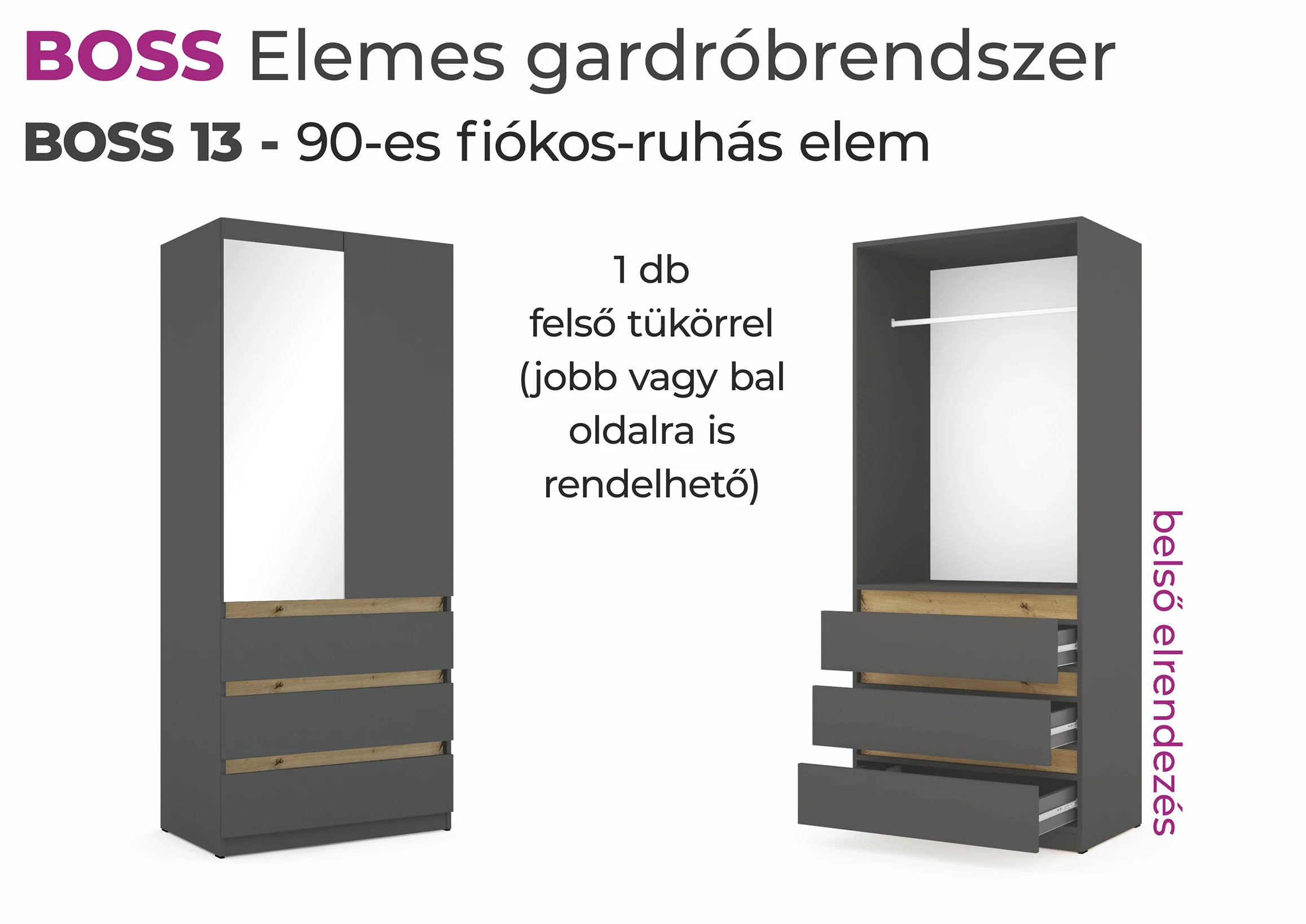 Boss elemes gardrób - 90-es fiókos ruhás elem (felül 1 tükrös)